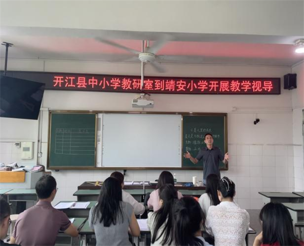 视导共安排四堂课,语数各两堂,靖安小学全体教师分学科参与。李奕林、唐茵茵等四位教师备课充分,教学设计紧扣新课标,聚焦学生核心素养培养,展现出扎实的教学基本功与良好风貌;课堂上学生积极参与、思维活跃,学习氛围浓厚。